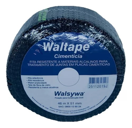 A Fita Waltape Cimentícia é uma fita telada composta por fios de fibra de vidro entrelaçados (formando uma malha), com uma das faces autoadesiva, destinada ao tratamento de juntas entre as placas cimentícias em paredes. A Walsywa fornece a fita Waltape Cimentícia em rolos de 46 m x 51 mm.